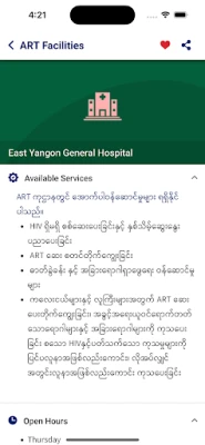 The mobile app has updated information on facilities providing anti-retroviral therapy (ART) and methadone maintenance therapy (MMT) throughout Myanmar. The user can navigate the location of the facility as per state/ region and then the facility information in the app.